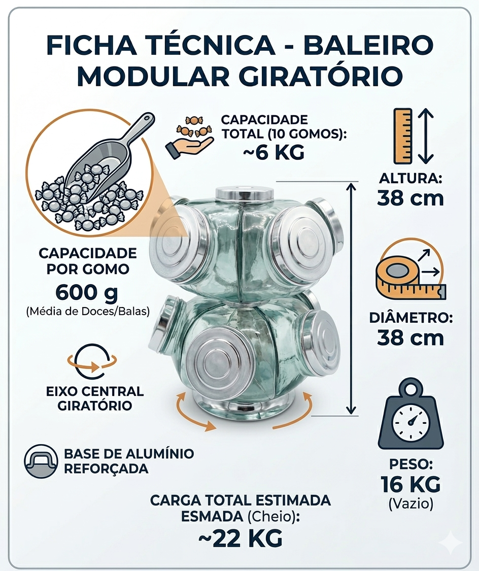Fabricado com vidro de alta qualidade, proporciona excelente visibilidade dos produtos, valorizando balas, doces e outros itens. Sua estrutura conta com acabamentos em alumínio, garantindo maior durabilidade, resistência e um toque moderno ao design.