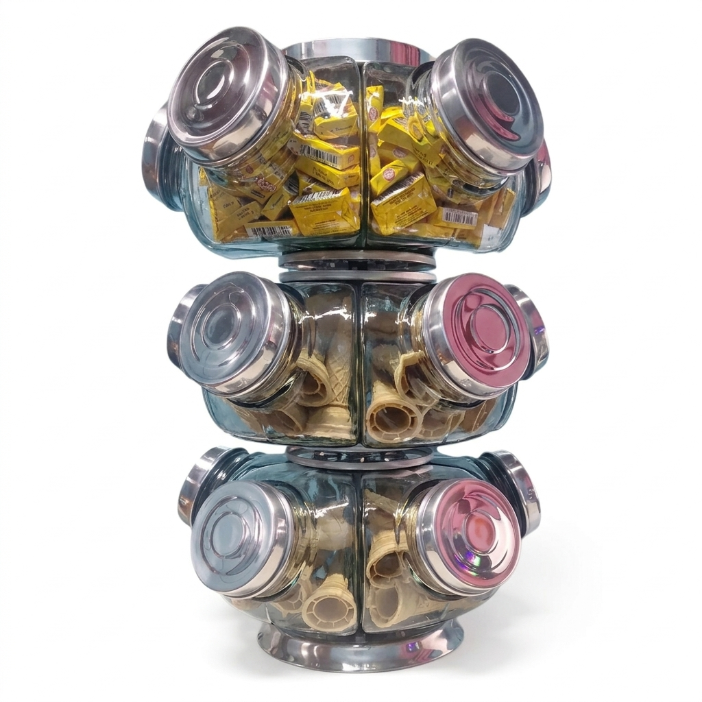 Baleiro Giratório Retrô Grande Triplo  Cor Alumínio Polido, Capacidade de Armazenar 10,5 Kg de Balas.